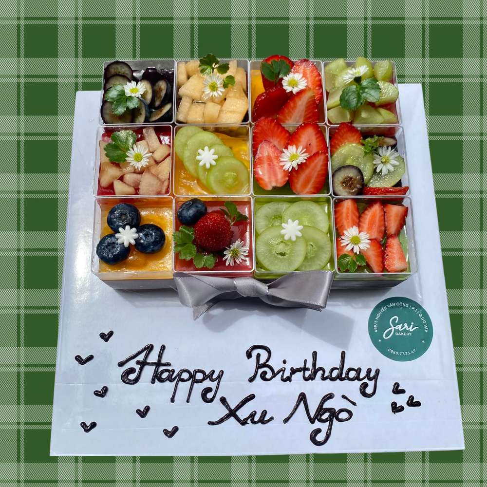 12 panna cotta ly vuông decor là set bánh lạnh “nhìn là yêu – ăn là mê” tại Sari Bakery. Mỗi ly panna cotta được làm tươi mỗi ngày, kết cấu mềm mịn, mát lạnh và ngọt dịu. Phần decor trái cây tươi được cắt và sắp xếp thủ công để tạo hiệu ứng sang – xinh – nổi bật trên bàn tiệc.