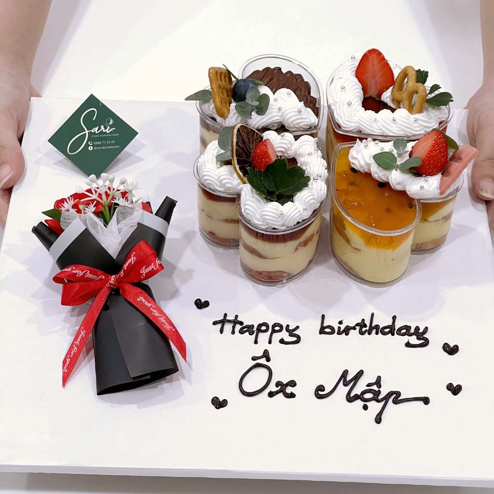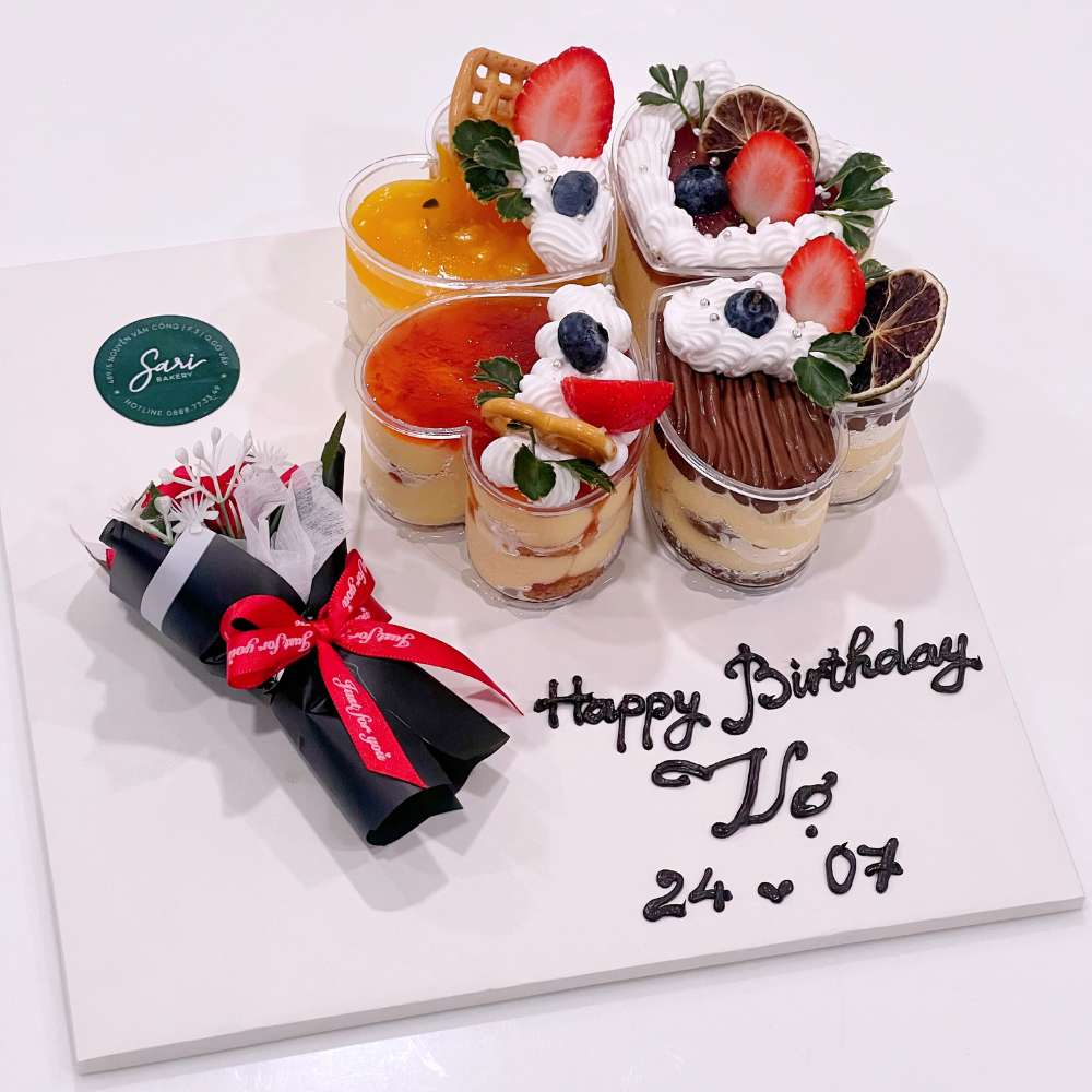 Mỗi ly bánh tim được mix ngẫu nhiên nhiều vị khác nhau, kết hợp cùng bó hoa nhỏ trang trí, tạo nên tổng thể hài hòa và giàu cảm xúc.