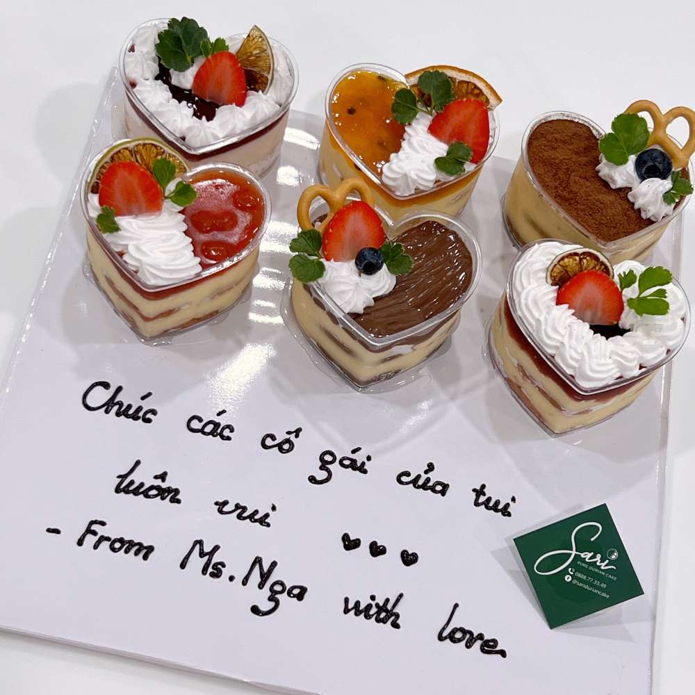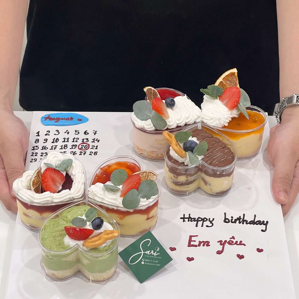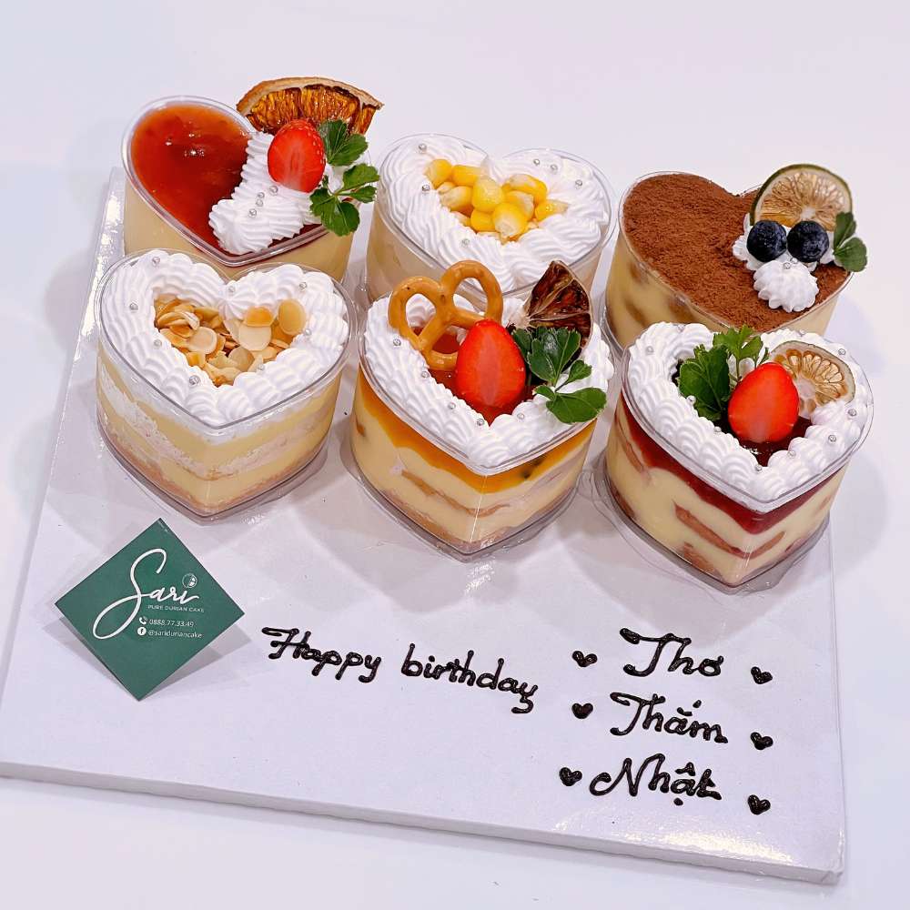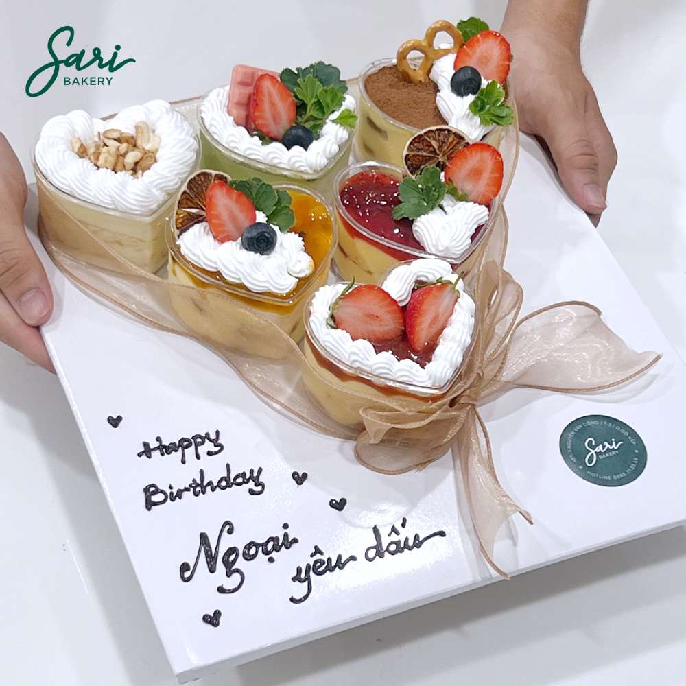 Set 6 ly tim mix vị là lựa chọn bánh sinh nhật mini và bánh tiệc nhỏ được yêu thích tại Sari Bakery. Set gồm 6 ly bánh hình tim với nhiều loại – nhiều vị khác nhau, trang trí đẹp mắt, dễ ăn và phù hợp cho mọi lứa tuổi.