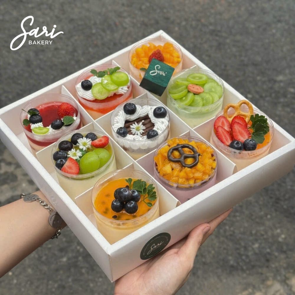 9 ly tròn mix vị là set bánh nhỏ gọn nhưng đủ đầy trải nghiệm, được Sari Bakery tạo ra dành cho những ai muốn thưởng thức, nhiều hương vị trong một phần bánh vừa phải. Mỗi ly là một sắc thái riêng, kết hợp hài hòa giữa vị béo, vị mát và vị ngọt dịu.