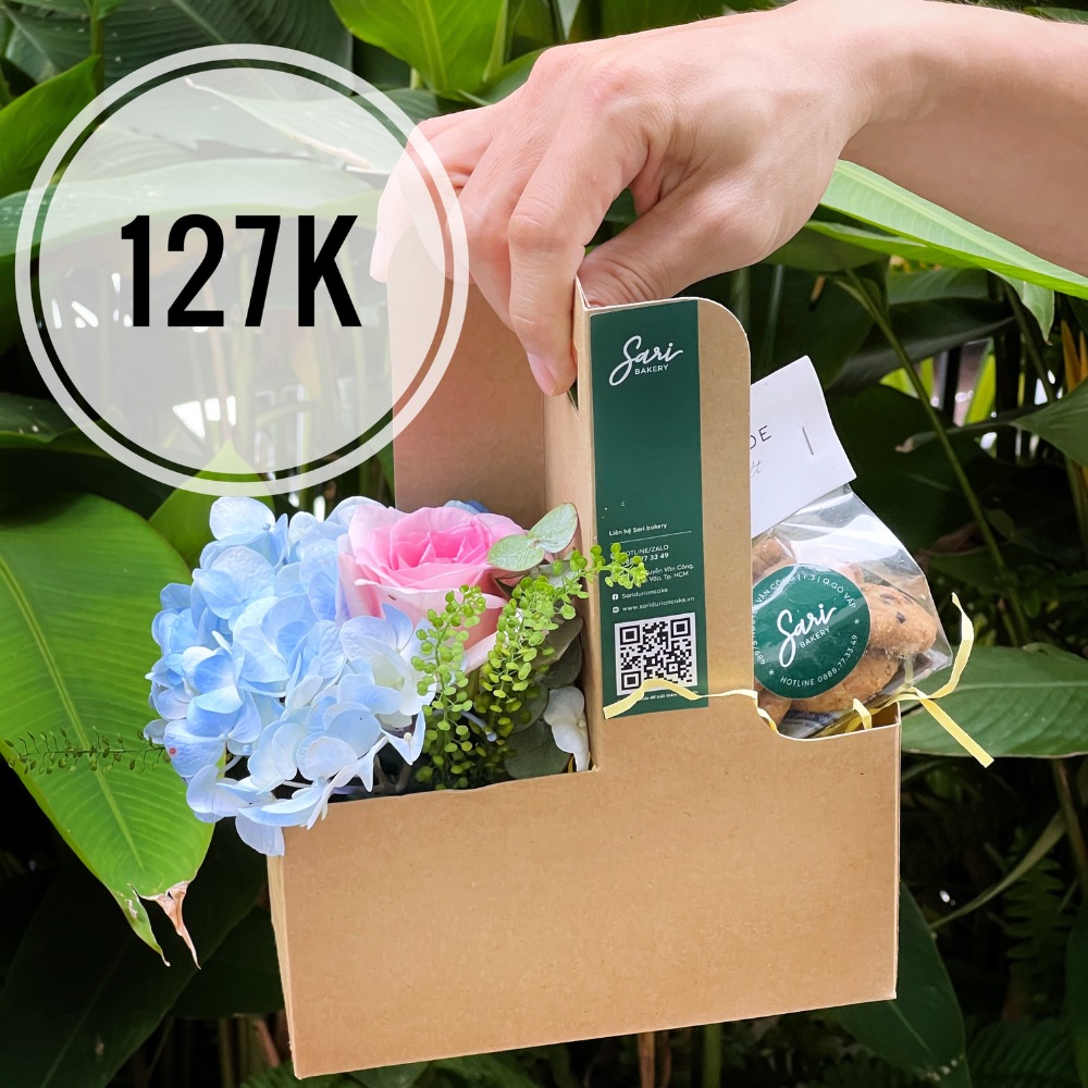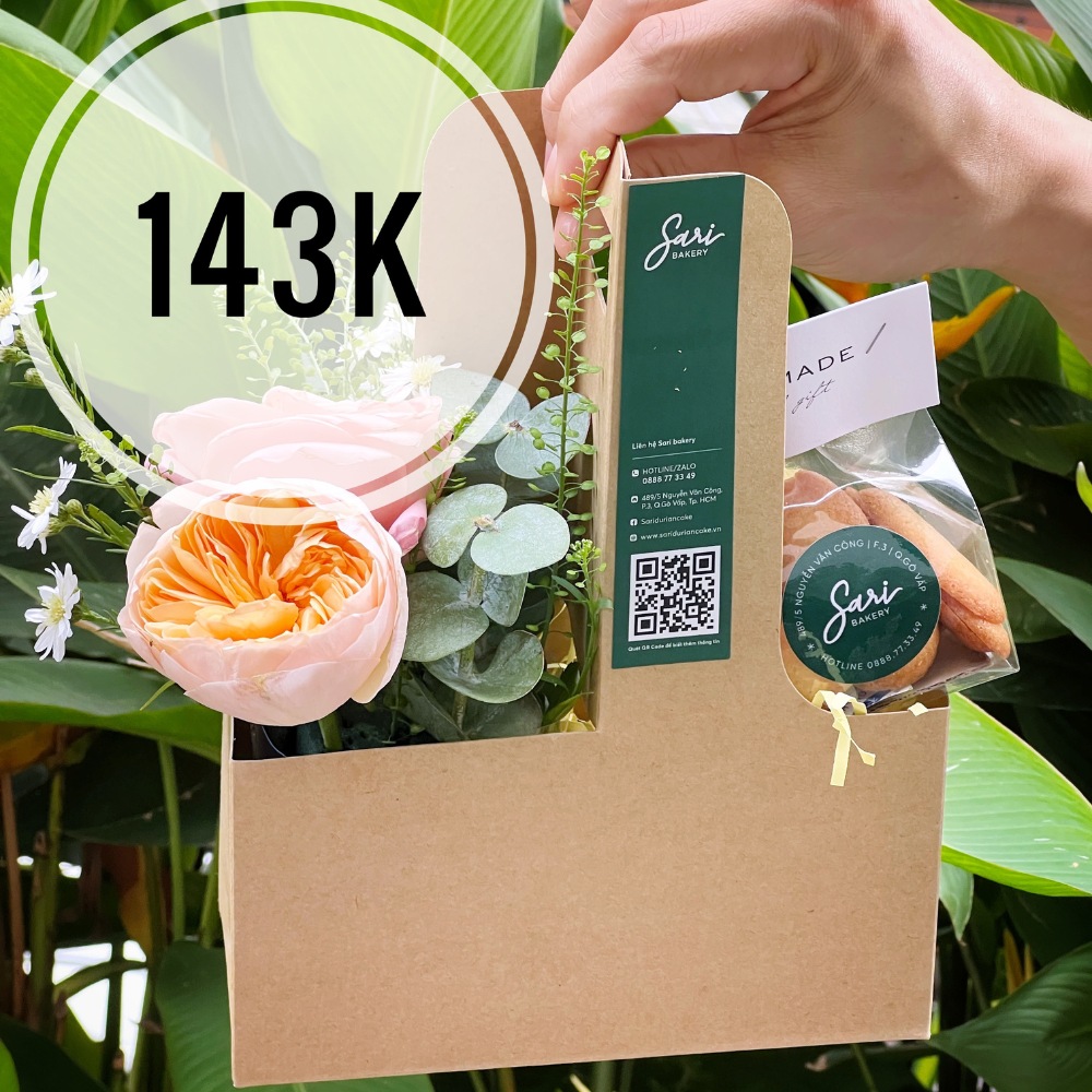 Hộp quà xách giấy kraft phối hoa hồng hồng và bánh/đồ ngọt mini – Sari Bakery